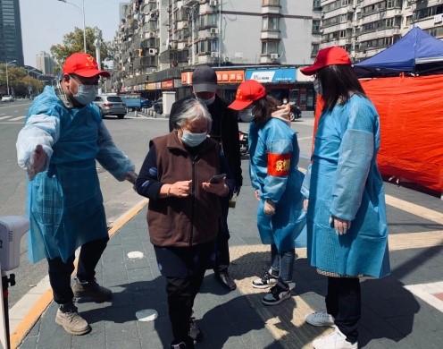 在區進行的四輪全員核酸檢測的組織現場,志愿者們換上藍色防護衣,戴好防護面板,套上紅色防疫袖套,根據安排分工配合:有進行信息核查步驟的,在進口處測量體溫、查驗健康碼、行程碼,指導幫助老人操作手機、協助居民注冊核酸采樣碼,問詢疫苗接種情況;有在隊伍旁維持現場秩序,引導群眾保持安全距離的;有積極進行疫情防控知識宣傳工作的,推廣便民的場所碼、好通碼,宣講疫苗接種……有力促進了全員核酸檢測工作有序、高效、安全開展。