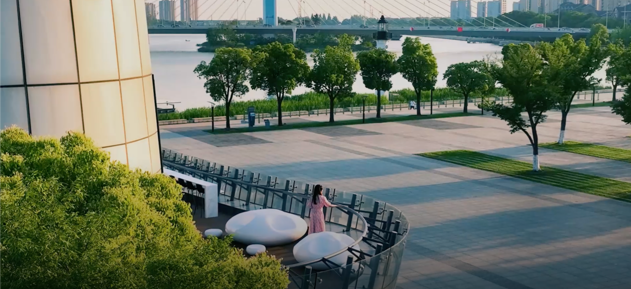 建筑緊鄰雙運河水岸,整體以玻璃幕墻圍合,形成水岸上的游輪造型。門前廣場為市民提供漫步、會談的場所,二樓露臺布置云朵狀座椅,在加強室內外聯(lián)系的同時,生動詮釋運河水岸人與自然和諧共處的生活場景。